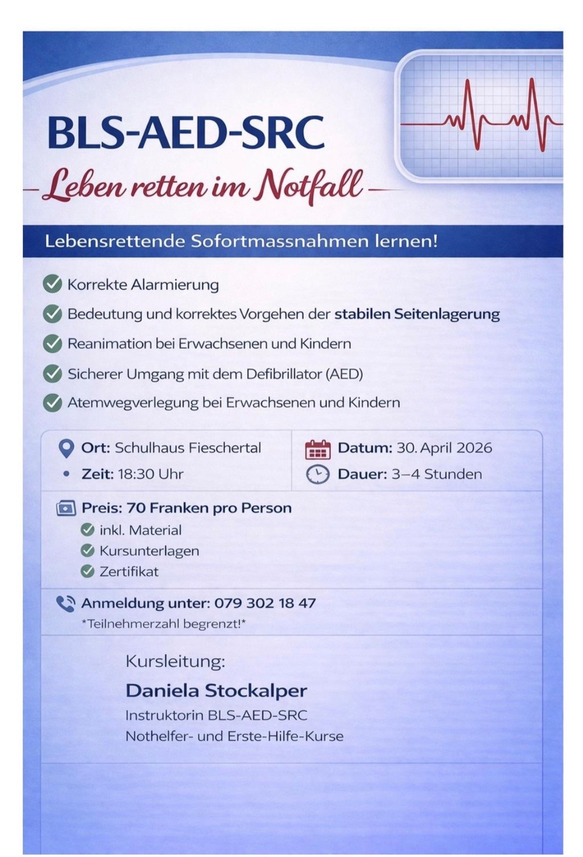| 30. April 2026 | BLS - AED - SRC | Schulhaus FieschertalSchulhaus Fieschertal | |||||||||||||||||||||||||||||||||||||||